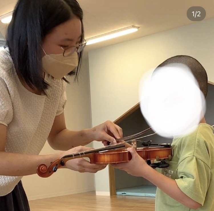 子供たちにも実際にバイオリンを体験させました!初めてながらも、よく弾けてましたよ✨